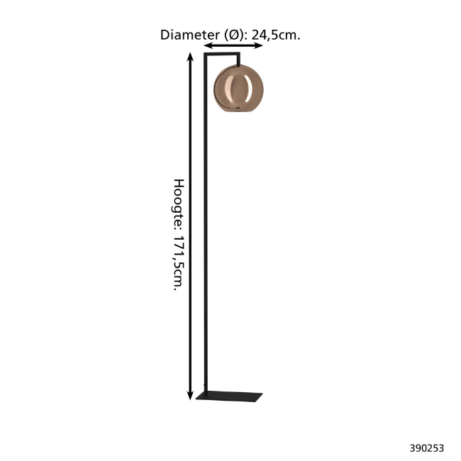 Het zwarte stalen armatuur geeft de lamp een stoere, industriële uitstraling en vormt een mooi contrast met het warme koperkleurige glas. De lamp is geschikt voor een E27 lichtbron tot maximaal 40 watt (niet inbegrepen), waardoor je zelf de lichtkleur en intensiteit bepaalt. Dankzij de stekkersnoer met aan/uitschakelaar is de vloerlamp eenvoudig in gebruik.