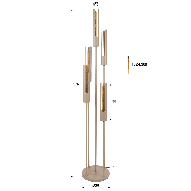 De vloerlamp Titan 5-lichts heeft een strak en modern ontwerp met vijf slanke kokers die trapsgewijs omhoog lopen. Het metalen armatuur in een rustige beige kleur geeft de lamp een minimalistische uitstraling die perfect past binnen moderne en hotel chique interieurs.