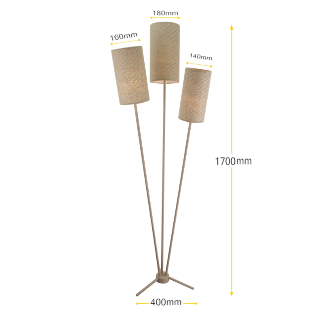Met een hoogte van 170 cm en een stabiele voet van 40 cm staat de lamp stevig en komt hij mooi tot zijn recht in de ruimte. De Zizal is voorzien van drie E27 fittingen, zodat je zelf de gewenste lichtbronnen kiest. Dankzij de handige voetschakelaar bedien je de lamp eenvoudig. Een stijlvolle en praktische toevoeging aan ieder interieur.