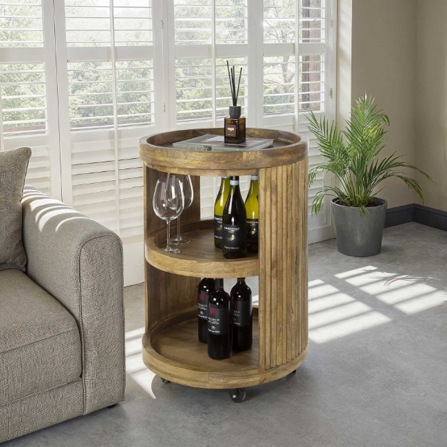 De Drex wijntrolley is een perfecte combinatie van functionaliteit en stijl. Vervaardigd uit massief mangohout met een warme zandkleurige finish, straalt deze trolley een landelijke charme uit die moeiteloos in elk interieur past. De verticale lijnen in het hout geven het ontwerp een speels en tijdloos karakter.